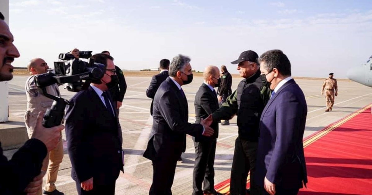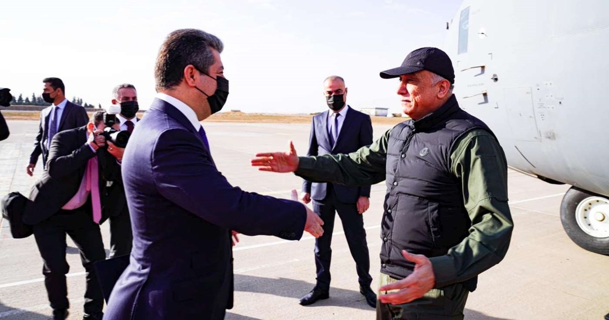 اربيل ، اقليم كوردستان، العراق (GOV.KRD)- استقبل رئيس حكومة إقليم كوردستان مسرور بارزاني في مطار أربيل الدولي، اليوم الأربعاء 8 كانون الأول (ديسمبر) 2021، رئيس الوزراء الاتحادي مصطفى الكاظمي.
