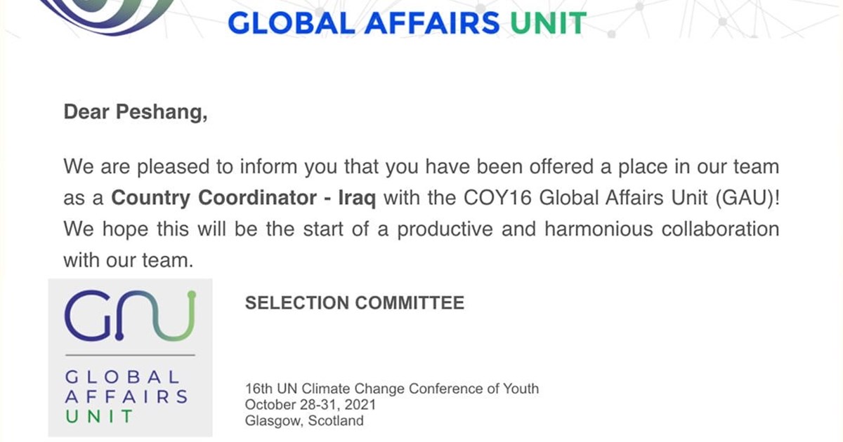 Poland (GOV.KRD) - Mr. Peshang Hama Karim a PhD student at the Warsaw University (Poland) has been appointed as a Country Coordinator of Iraqi delegation to the Conference of Youth - UN Climate Change which will be held on October 28-31, 2021 in Glasgow.