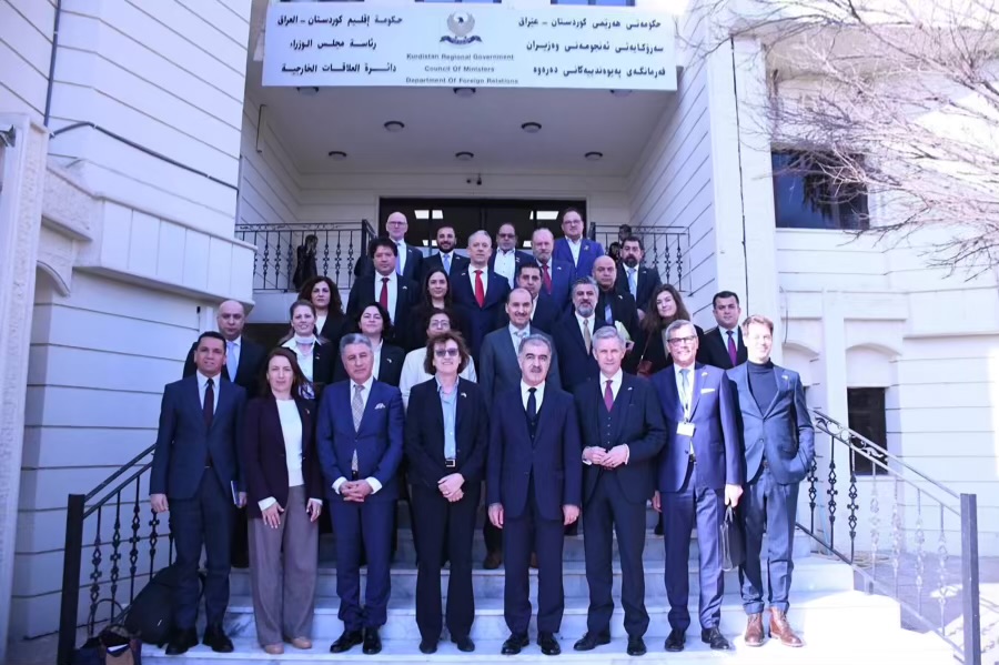 ئەمڕۆ چوارشەممە، ٤ی شوباتی ٢٠٢٦، سەفین موحسین دزەیی بەرپرسى فەرمانگەى پەیوەندییەکانى دەرەوە، پێشوازى لە شاندێکى باڵاى بازرگانیی ئەڵمانیا کرد؛ کە بریتى بوون لە وەزارەتى بازرگانى و ئابووریی ئەڵمانیا، ژوورى بازرگانیی ئەڵمانیا و نوێنەرى چەندین کۆمپانیاى ئەو وڵاتە.