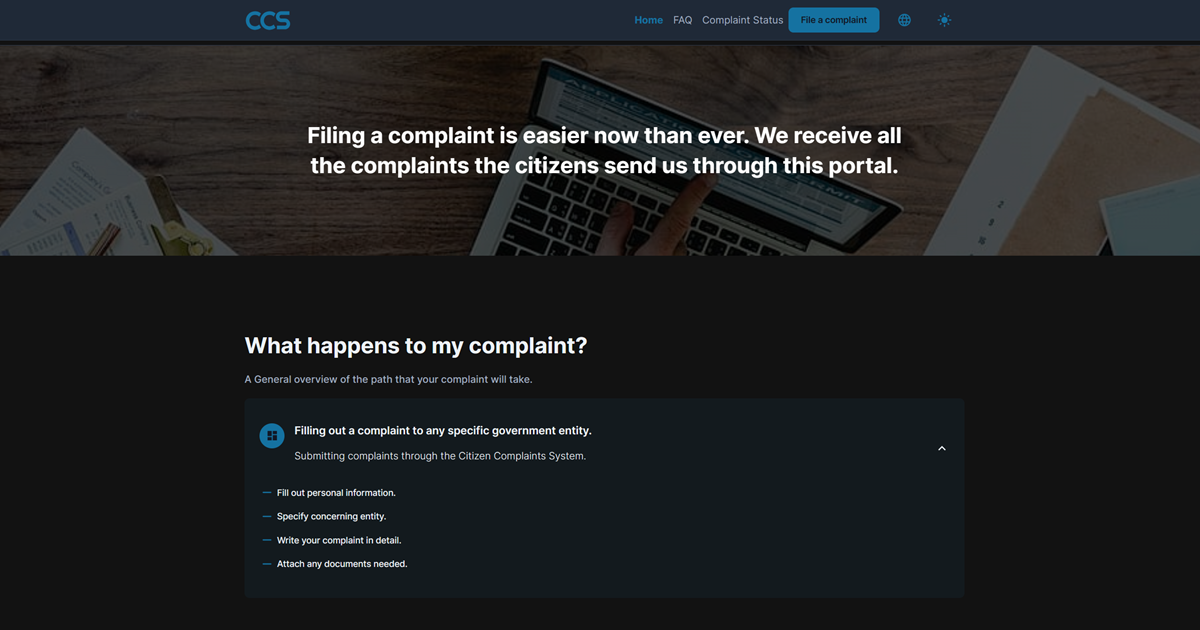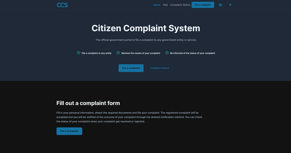 The Department of Information Technology (DIT) proudly announces the launch of the Citizen Complaint System (CCS), an online portal that allows citizens to easily submit complaints and receive feedback from government entities.