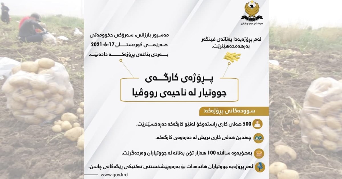 سەرۆکى حکومەتى هەرێمى کوردستان بە ئامادەبوونى وەزیری کشتوکاڵ و سەرچاوەکانی ئاو، بەردی بناغەی پڕۆژەی (کارگەی جووتیار بۆ بەرهەمهێنانی فینگەر و چیپس لە پەتاتەی پیشەسازی) لە ناحیەی ڕۆڤیاى سەر بە پارێزگاى دهۆک دانا.
