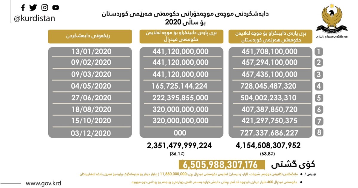 هەولێر، هەرێمی کوردستان، عێراق (GOV. KRD) - بەپێی ئەم خشتەیەی خوارەوە، حکومەتی ھەرێمی کوردستان لە ساڵی 2020دا، (8) مووچەی بەسەر مووچەخۆرانی ھەرێمی کوردستاندا دابەشکردووە. لەو (8) مووچەیەش حکومەتی فیدراڵ تەنیا (6) مووچەی بۆ ھەرێمی کوردستان ناردووە.