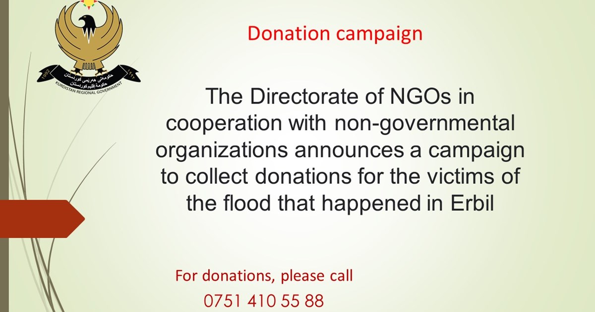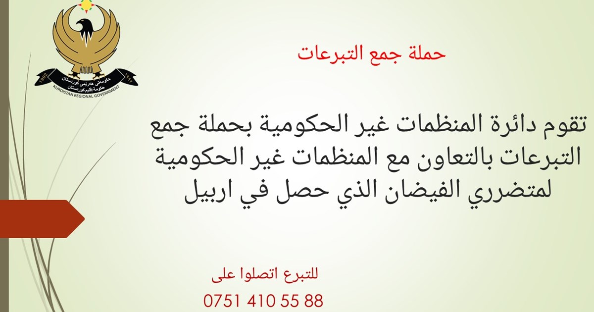 هەولێر، هەرێمی کوردستان، عێراق (GOV.KRD)- فەرمانگەی رێکخراوە ناحکومییەکان کەمپەینێکی کۆکردنەوەی هاوکاری بۆ قەرەبوو کردنەوەی زیانلێکەوتووانی لافاوەکەی هەولێر ڕادەگەیەنێت. کەمپەینەکە بۆ ماوەی دوو هەفتە بەردەوام دەبێت. بۆ زانیاری زیاتر دەربارەی شێواز و جۆری هاوکارییەکان تکایە پەیوەندی بکەن بەم ژمارە تەلەفۆنەوە: 07514105588