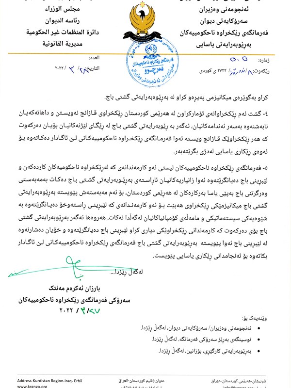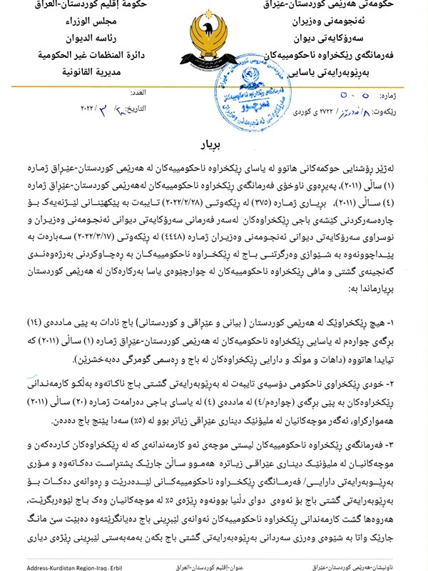 هەولێر، هەرێمی کوردستان، عێراق (GOV.KRD)-دوای هەوڵی بەردەوامی سەرۆک و ستافی نوێی فەرمانگەی ڕێکخراوە ناحکومییەکان لەماوەی ساڵی ڕابردوودا، تواندرا کێشەی باجی ڕێکخراوەکان  بە پاڵپشتی سەرۆکایەتی دیوان و بە هاو ئاهەنگی و هەماهەنگی لەگەڵ بەڕێوەبەرایەتی گشتی باج و دەرامەت چارەسەر بکرێت کە بە جۆرێک لەمەودوا ئەو ڕێکخراوانەی خۆبەخشن و یاخود فەرمانبەری مووچەخۆریان نیە، پێویست ناکات سەردانی بەڕێوەبەرایەتی گشتی باج و دەرامەت بکەن بە مەبەستی وەرگرتنی پاکانەی باج، هەروەها بۆ ئەم مەبەستە داوا لە ڕێکخراوەکان دەکەین کە ناوەڕۆکی بڕیاری فەرمانگە پەیوەست بە ڕێکخستنی باجی کارمەندانی ڕێکخراوەکان بخوێننەوە وەکو لە وێنەکەدا هاتووە.