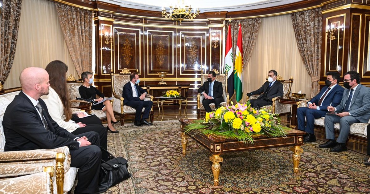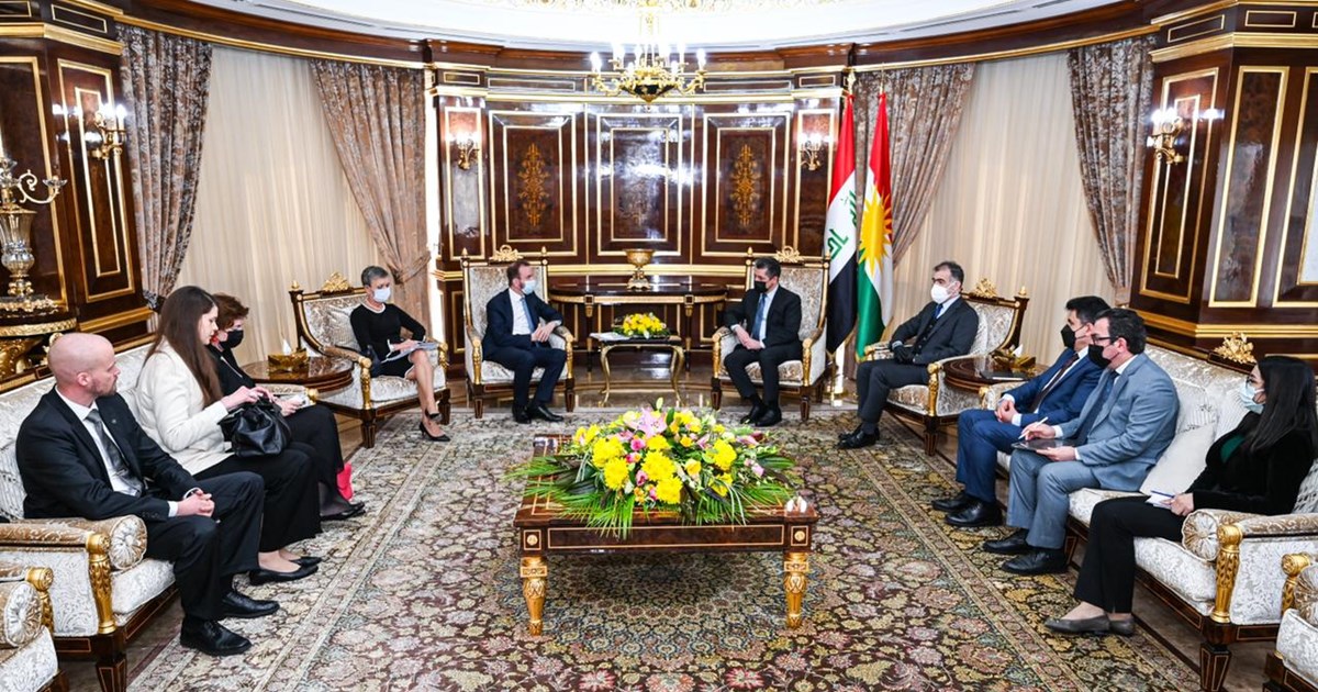 Erbil, Kurdistan Region, Iraq (GOV.KRD) - Prime Minister Masrour Barzani on Tuesday met with a European Union delegation led by Ville Varjola, the EU Ambassador to Iraq and Head of EU Advisory Mission in Iraq, Anne Meskanen.