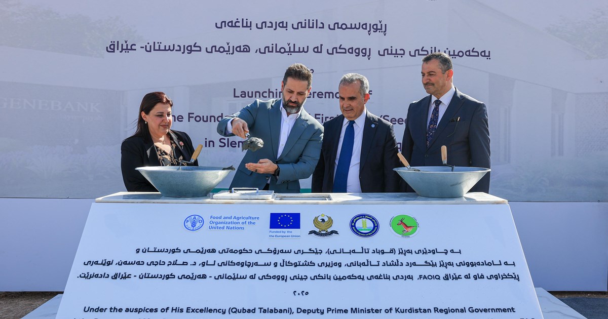 قوباد تاڵەبانی، جێگری سەرۆکوەزیران لە ڕێوڕەسمێکدا لە پارکی هەواری شاری سلێمانی بە ئامادەبوونی بێگەرد تاڵەبانی، وەزیری کشتوکاڵ و دکتۆر سەلاح، نوێنەری رێکخراوی فاو لە عێراق و دکتۆر هەڤاڵ ئەبوبەکر، پارێزگاری سلێمانی، ئەمڕۆ ٧ی تەمموز، بەردی بناغەی پڕۆژەی جین بانکی دانا.