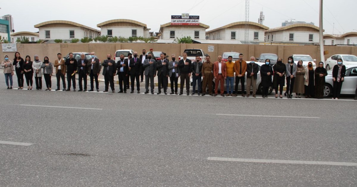 هەولێر، هەرێمی کوردستان، عێراق (GOV.KRD)- ئەمڕۆ سێ شەممە 2021/3/16 دەزگای گشتی كاروباری مین بە ئامادەبوونی جەبار مستەفا سەرۆكی دەزگا و بەرێوەبەرەگشتیەكان و فەرمانبەران و كارمەندانی یادی33ساڵەی كارەساتی هەڵەبجە بەرز رادەگرن بەوەستانیان لەبەردەم بینای سەرەكی دەزگای گشتی كاروباری مین وەك رێزگرتنێك لەو ژمارە قوربانیە زۆرەی گەلی كوردستان لەو رۆژە دا.