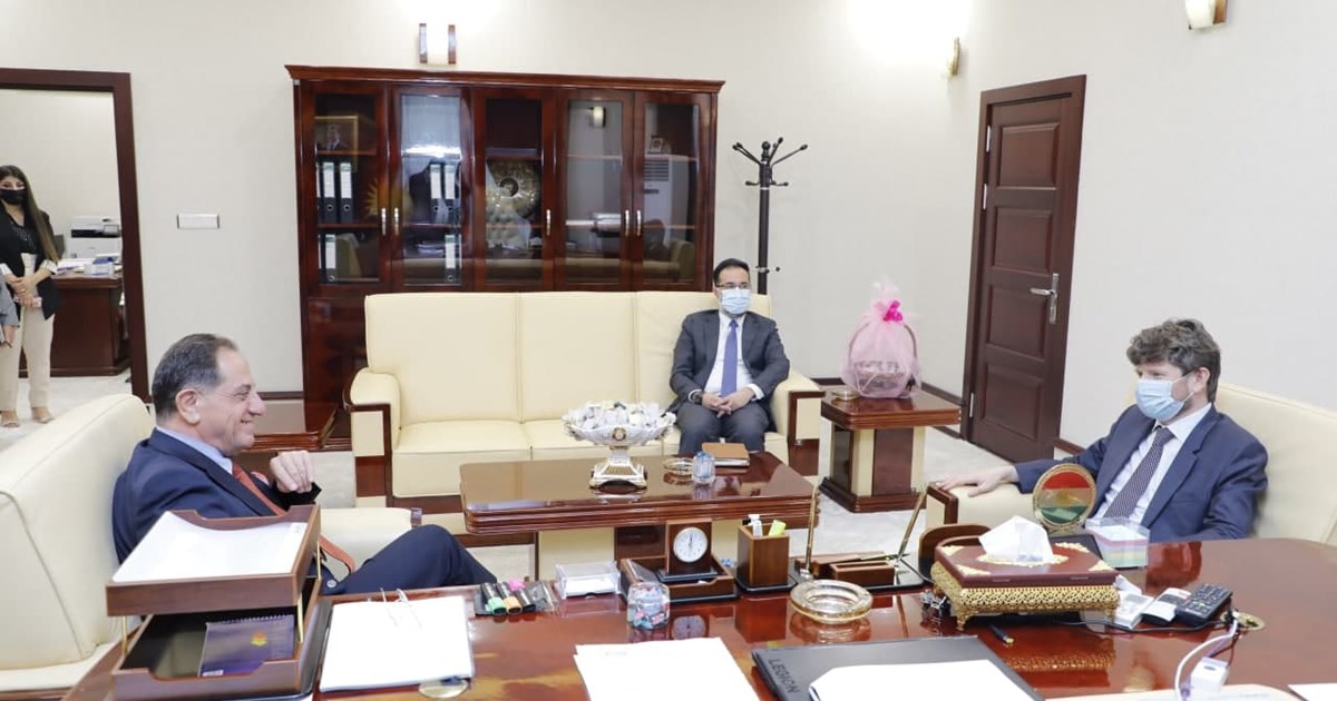 هەولێر، هەرێمی کوردستان، عێراق (GOV.KRD)- رۆژی پێنج شەممە رێکەوتی ٨ی تەمووزی ٢٠٢١، د.کەمال ئەتروشی وەزیری سامانە سروشتییەکانی حکومەتی هەرێمی کوردستان، پێشوازی لە بەڕێز ئۆلیڤییە دێکۆتینی کۆنسوڵی گشتی فەرەنسا و موحەمەد فەیزی سەرۆکی بەشی ئابووری لە کونسوڵی گشتی فەرەنسا لە هەولێر کرد.