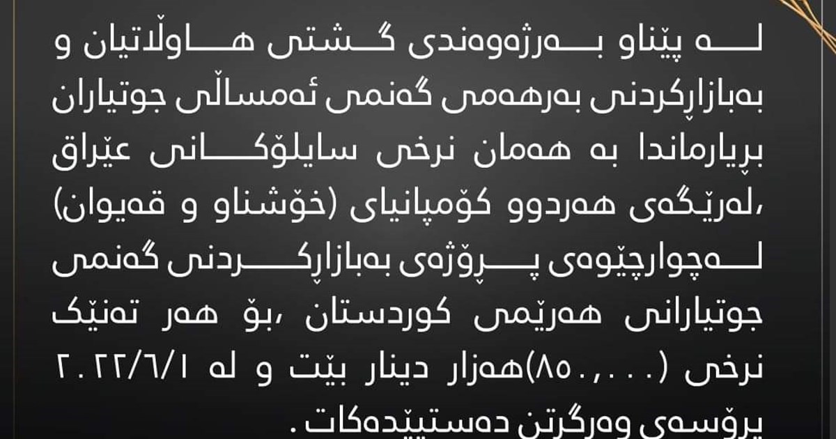 لە پێناو بەرژەوەندیی گشتیی هاووڵاتیان و بە بازاڕکردنی بەرهەمی گەنمی ئەمساڵی جوتیاران ،بریاردرا بەکڕینەوەی گەنمی جوتیاران لە دەرەوەی پڕۆسەی وەرگرتنی گەنم لە سایلۆکانی هەرێمی کوردستان