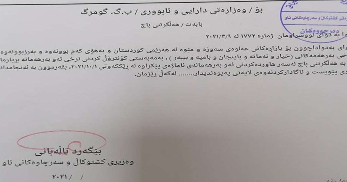 لەپێناو چاودێری و کۆنترۆڵکردنی نرخ و بەرژەوەندیی گشتیی هاووڵاتیان و خاوەن کارەکان، بڕیاردرا بە هەڵگرتنی باج لەسەر هاوردەکردنی بەرهەمەکانی خەیار و تەماتە و باینجان و بامیە و بیبەر