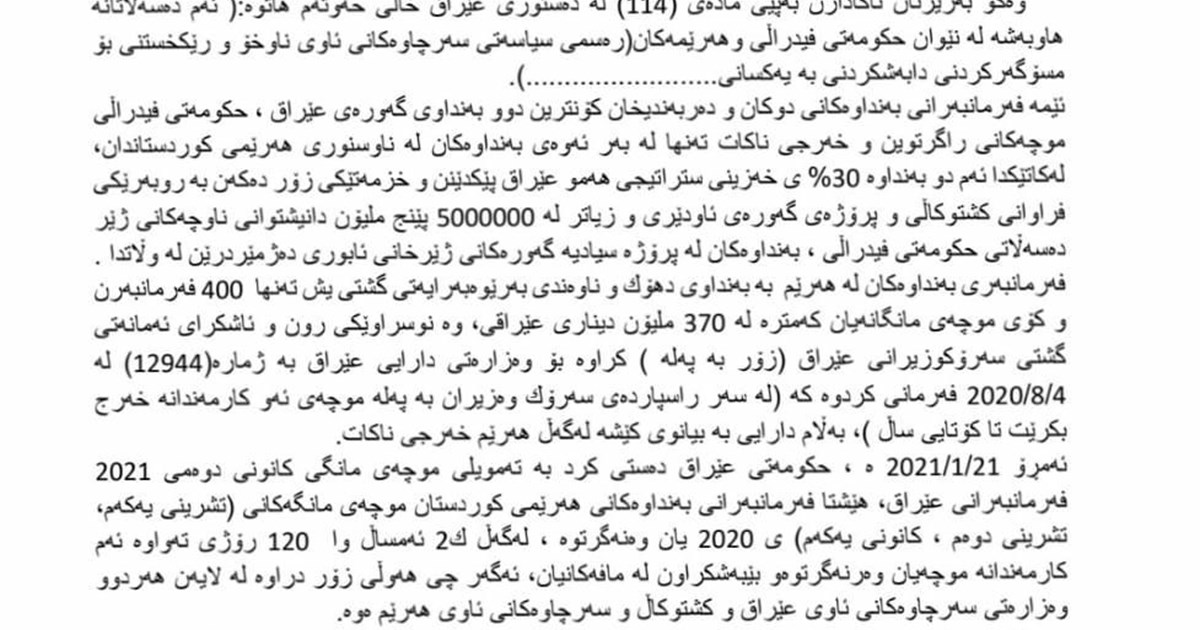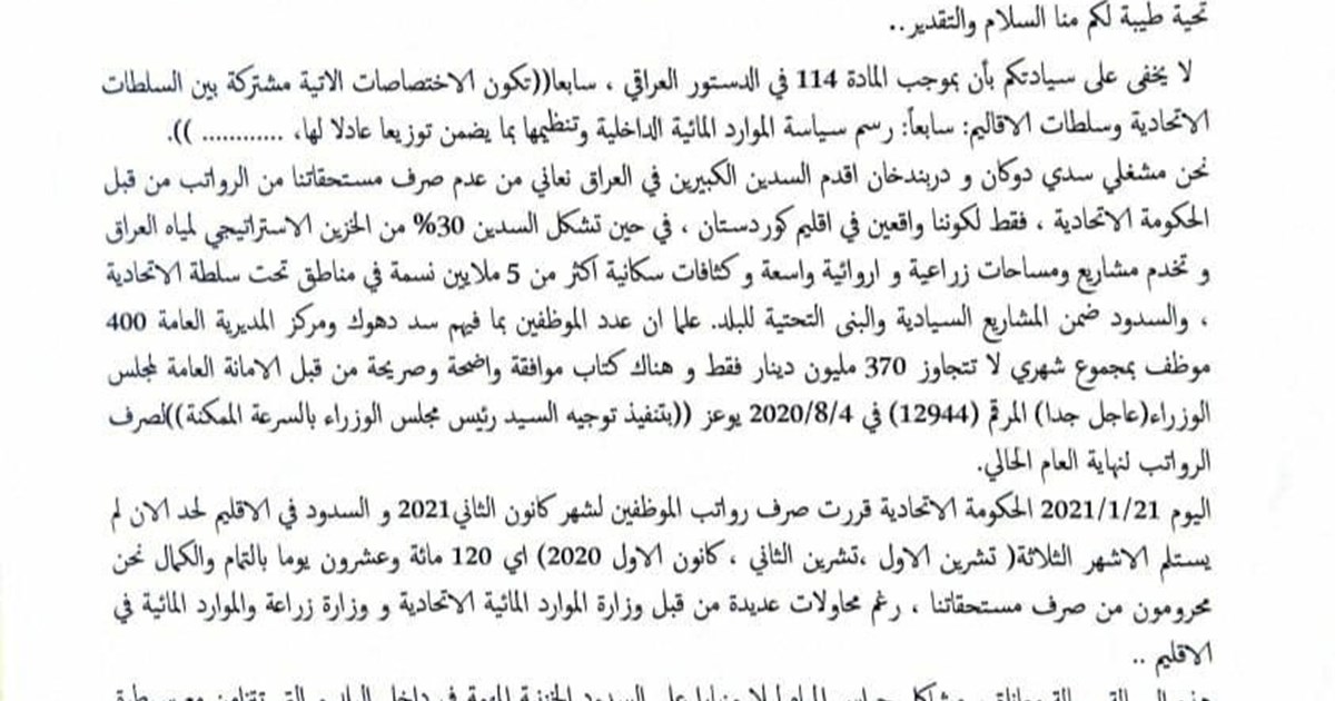 جێگای وەبیرهێنانەوەیە لە دواین سەردانی هەفتەی ڕابردوو کە پێک هاتبوو لە شاندێکی باڵای وەزارەت بەسەرۆکایەتی بێگەرد تاڵەبانی بۆ بەغدا، بەو پەڕی پەرۆیشی و بەرپرسیاریەتیەوە بێگەرد تاڵەبانی، درافتی تایبەتی وەزارەتەکەی دەربارەی چارەسەری دواکەوتنی موچەی کارمەندان و کێشەکانی تایبەت بە بەنداوەکان، پێشکەش بە بەڕێزان سەرۆک کۆماری عێراق و لێژنەی کشتوکاڵی و ئاودێری لە ئەنجومەنی نوێنەرانی عێراق و وەزارەتی سەرچاوەکانی ئاوی عێراق کردبوو.
