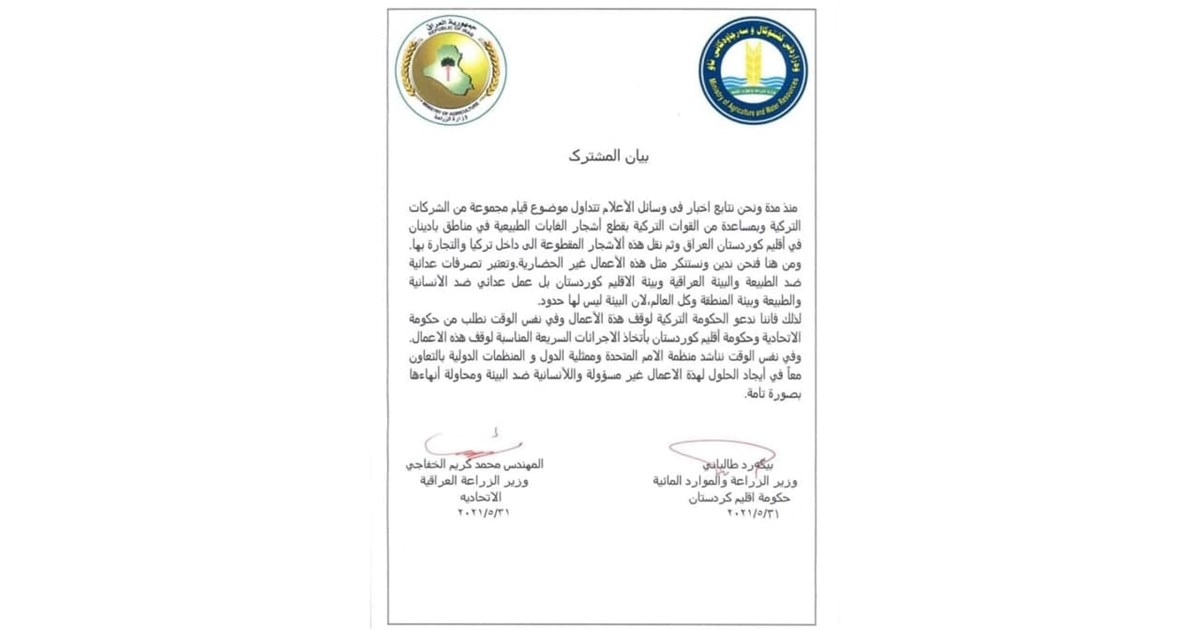 هەولێر، هەرێمی کوردستان، عێراق (GOV.KRD)-هەردوو وەزارەتی کشتوکاڵی عێراق و هەرێمی کوردستان سەبارەت بەبڕینەوەی داری دارستانە خۆڕسکەکانی سنووری بادینان لەلایەن ژمارەیەک کۆمپانیای تورکی، بهیاننامهیهكی هاوبهشیان بڵاوكردهوهو تیایدا ئاماژهیان بهوه داوه كه ئهمه كارێكی دوژمنكارانهیه دژ به ژینگهی ناوچهكهمان و داوا دهكهن كه توركیا بهزووترین كات ئهمه رابگرێت.