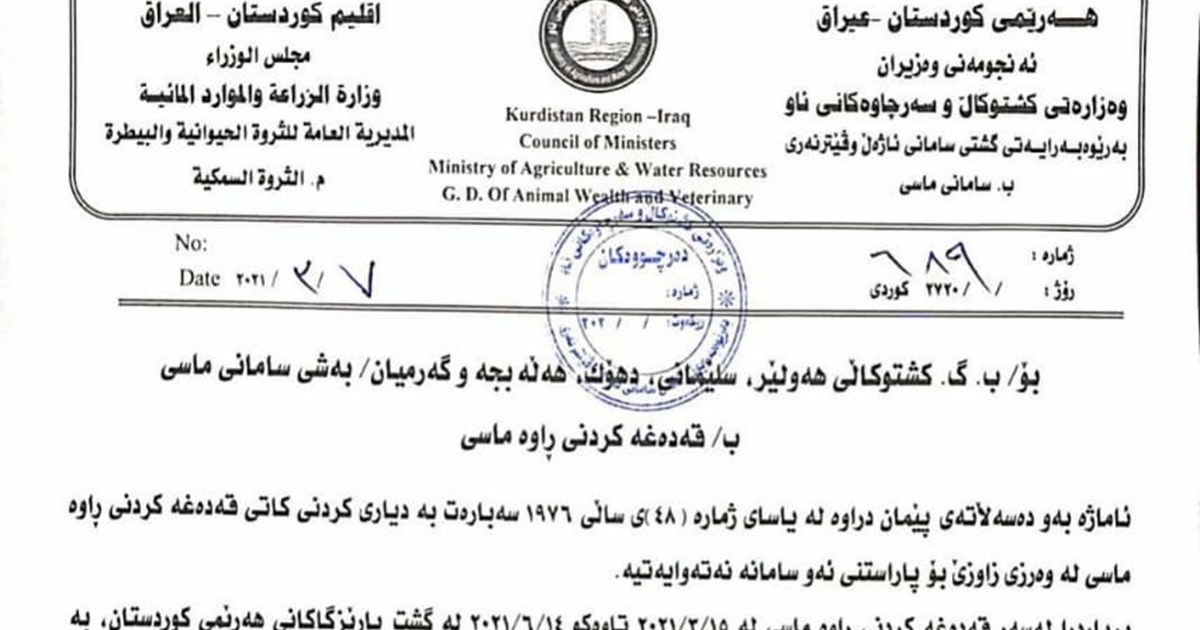 هەولێر، هەرێمی کوردستان، عێراق (GOV.KRD)- ئەمڕۆ سێ شەممە 2021/3/9 وەزارەتی کشتوکاڵ و سەرچاوەکانی ئاو بە نوسراوی ژمارە 689 لە 7/3/2021 بڕیاری قەدەغەکردنی کاتی ڕاوە ماسی بە هەموو شێوازەکان دەردەکات لە مەوسومی 15/3/2021 تا 14/6/2021.