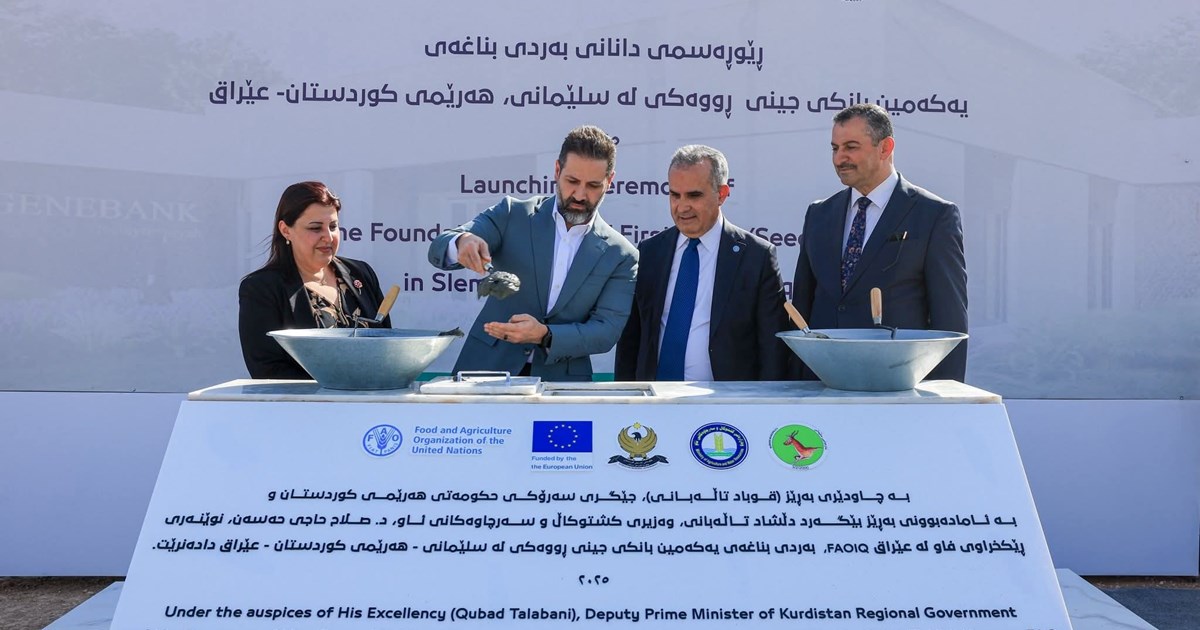 لەشاری سلێمانی بە ئامادەبوونی قوباد تاڵەبانی، جێگری سەرۆک وەزیرانی هەرێمی کوردستان، بێگەرد تاڵەبانی، وەزیری کشتوکاڵ و سەرچاوەکانی ئاو، پارێزگاری سلێمانی، د.صلاح ئەلحاج حەسەن، نوێنەری گشتیی ڕێکخراوی فاو لە عێراق، ژمارەیەکی بەرچاو لە بەرپرسانی حکومی و ئیداری و ستافێکی باڵای وەزارەت، لەسەر ڕووبەری ١٠٠دۆنم زەوی، لە ڕێوڕەسمێکدا بەردی بناغەی دامەزراندنی یەکەم بانکی جینی ڕووەکی، لە سلێمانی دانرا.