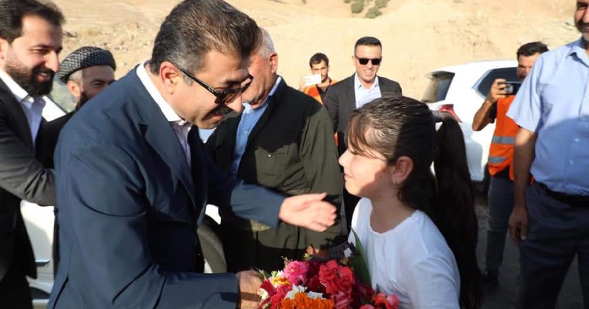 دانیشتوانی گوندەکانی سماقوڵی بە چەپکە گوڵەوە پێشوازی لە وەزیری ئاوەدانکردنەوە دەکەن