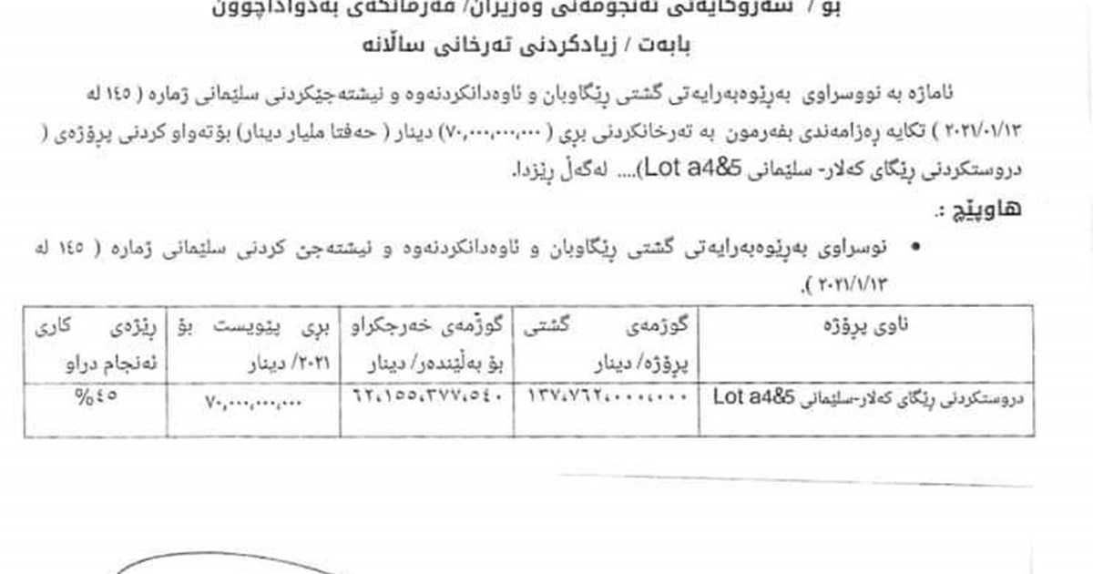 پێشتر لە ڕێکەوتی 2021/2/23, دانا عەبدولکەریم، وەزیری ئاوەدانکردنەوەو نیشتەجێکردن ، نووسراوێکی فەرمی ئاراستەی سەرۆکایەتی ئەنجوومەنی وەزیران کردبوو بە مەبەستی تەرخانکردنی بڕی (70)ملیار دینار بۆ تەواوکردنی پڕۆژەی دووسایدی رێگای(کەلار- دەربەندیخان).