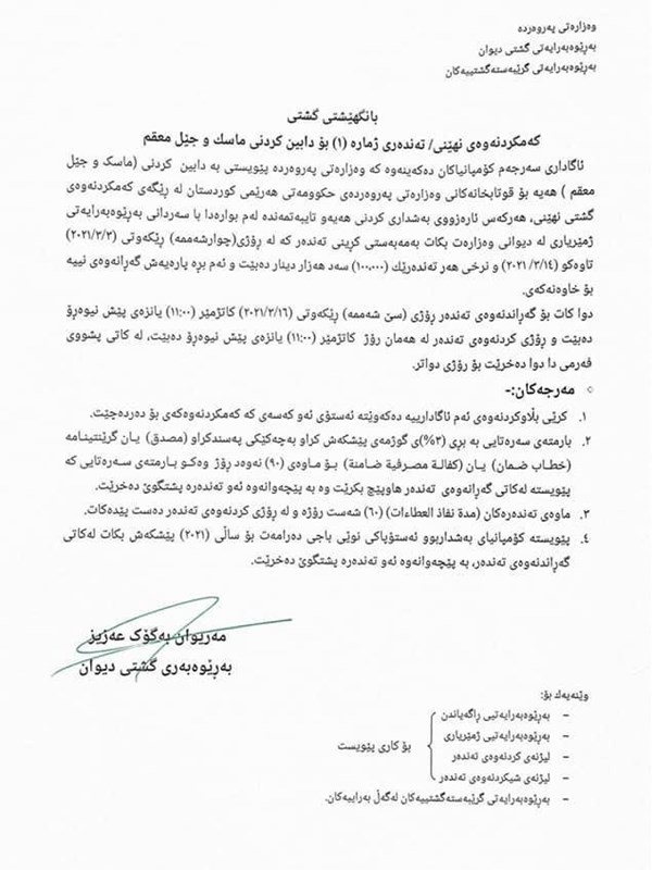 هەولێر، هەرێمی کوردستان، عێراق (GOV.KRD)- ئەمڕۆ چوارشەممە 2021/3/3 تەندەرى ژمارە (1) بۆ دابینکردنی ماسک و جێل معقم، ئاگاداری سەرجەم کۆمپانیاکان دهكهینهوه كه وهزارهتی پهروهرده پێویستی به دابینکردنی(ماسک و جێل معقم) هەیە بۆ قوتابخانەکان لە ڕێگەى کەمکردنەوەی گشتی نهێنى.