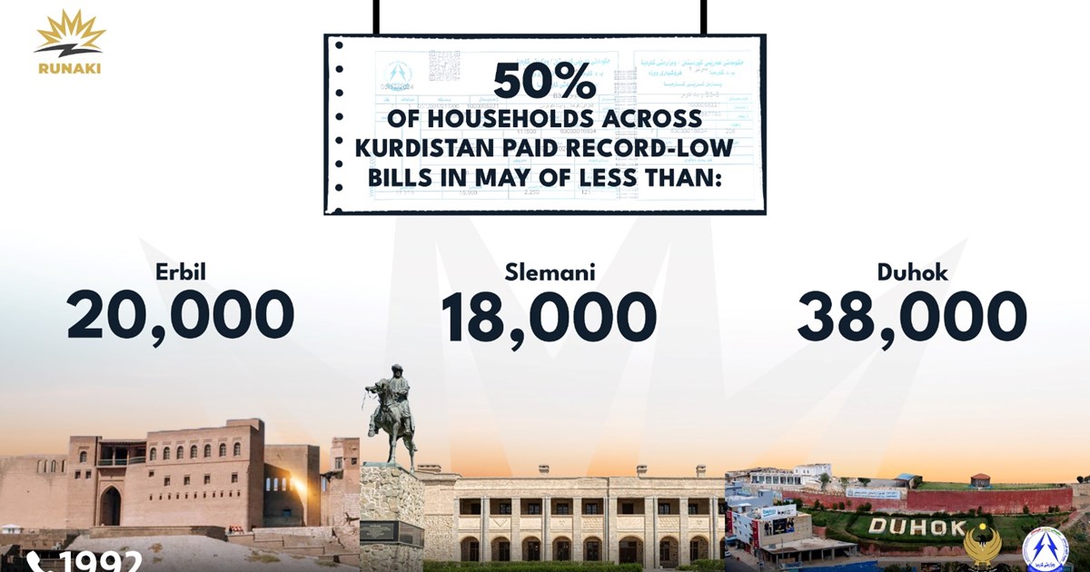 Erbil, Kurdistan Region (GOV.KRD) — The Ministry of Electricity is pleased to announce that record-low electricity bills for May were issued for families and businesses under the Runaki initiative.