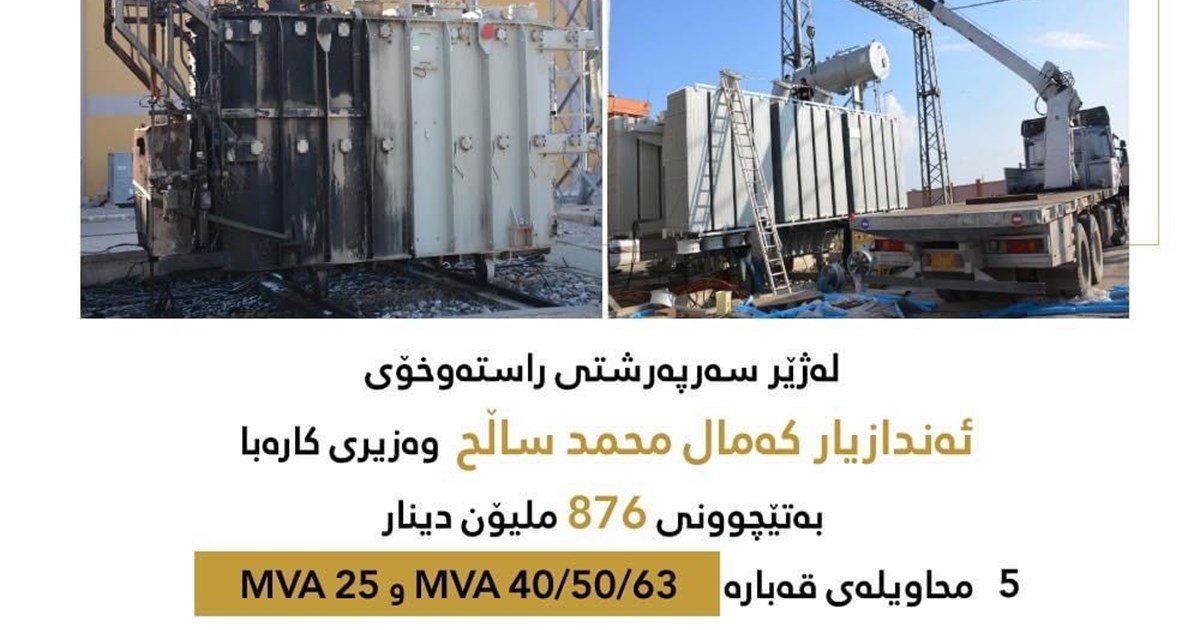بەتێچوونی 876 ملیۆن دینار 5 محاویلەی قەبارە 63/50/40 MVA و 125 MVA كە بەهۆی بارزۆری لەوەرزی هاوین و زۆری تەمەنی محاویلەكانەوە سوتابوون، نێردرانە وڵاتی توركیا و سەرجەم محاویلەكان چاككرانەوەو لەماوەیەكی كەمدا ئیشیان پێكرایەوە.