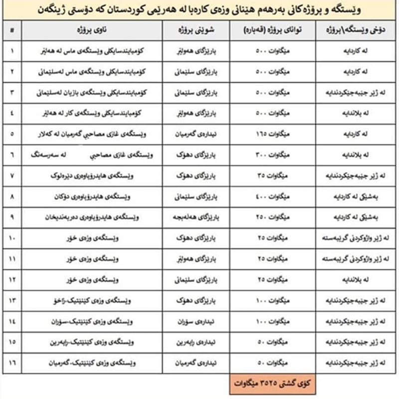 کۆی گشتی بەرهەمهێنانی کارەبا لە هەرێمی کوردستان دەگاتە 3525 مێگاوات کارەبا و لهو ژمارهیهش پڕۆژە ژینگەپارێزەکانی کارەبا لە 39% ی کۆی گشتی بەرهەمهێنانی کارەبای هەرێم پێک دێنن.
