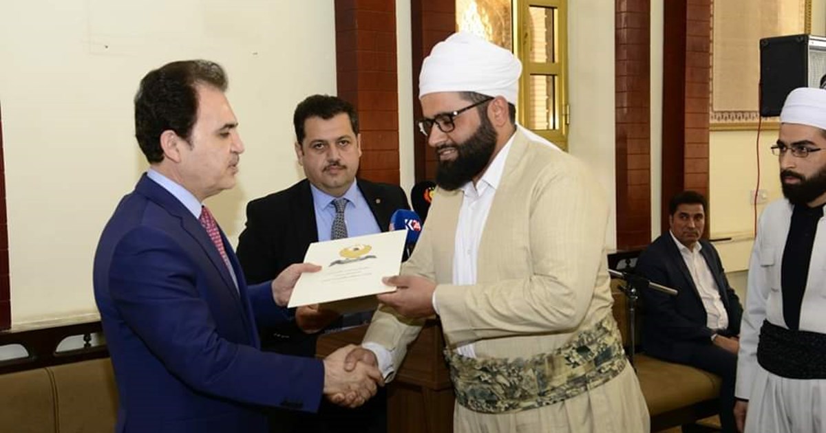 هەولێر، هەرێمی کوردستان (GOV.KRD)- رۆژی سێشەممە ٦ی کانوونی یەکەمی ٢٠٢٢، لە مەراسیمێکدا بەئامادەبوونی د. پشتیوان سادق، وەزیری ئەوقاف وکاروباری ئایینی، عەبدوڵا وەیسی، سەرۆکی یەکێتی زانایانی ئایینی ئیسلامی کوردستان، لە مزگەوتی جەلیل خەیات لە شاری ھەولێر، ڕێزلێنانی سەرۆکی حکومەتی هەرێمی کوردستان بە خشرایە دەرچووانی حوجرەکانی فەقێیان لە سەرتاسەری هەرێمی کوردستان.
