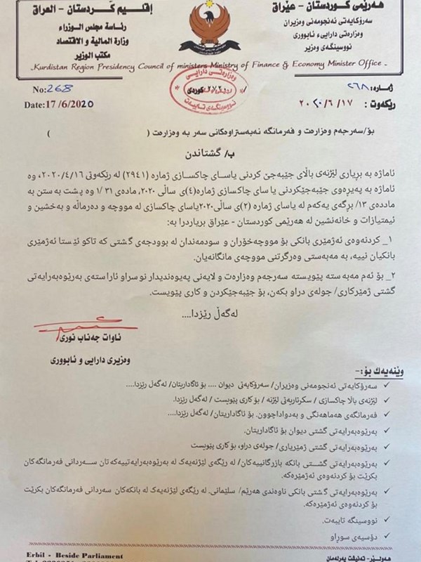 لە درێژەی پرۆسەی جێبەجێکردنی یاسای چاکسازی، وەزیری دارایی و ئابوری حکومەتی ھەرێمی کوردستان واژۆی کرد لەسەر جێبەجێکردنی بڕیاری لیژنەی باڵای جێبەجێکردنی یاسای چاکسازی کەتایبەتە بە کردنەوەی ئەژمێری بانکی بۆ موچەخۆران و سودمەندان لە بودجەی گشتی کەتاکو ئێستا ئەژماری بانکیان نیە.