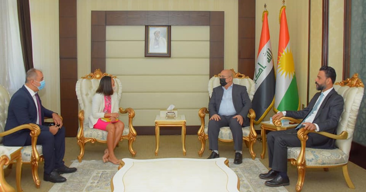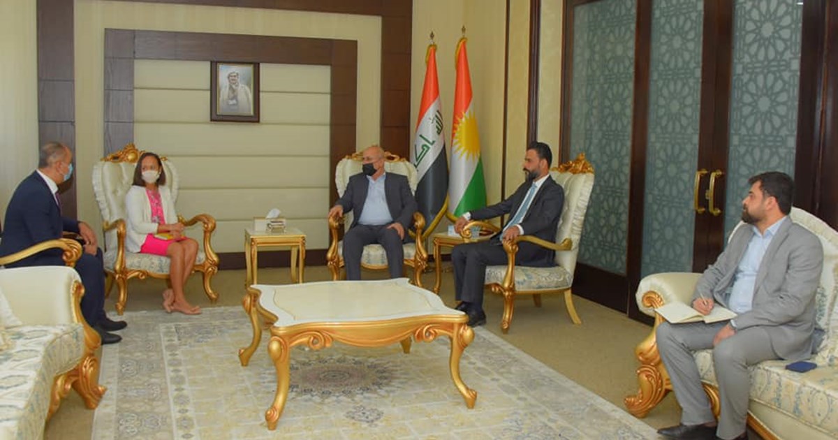 هەولێر، هەرێمی کوردستان، عێراق (GOV.KRD)- سەر لەبەیانی ڕۆژی چوارشەممە 25ی ئابی 2021، ئاوات جەناب نوری وەزیری دارایی و ئابووری لە دیوانی وەزارەت پێشوازی لە (دو تاينتواتچ) بەرپرسی بەشی سیاسی-ئابووری لە كونسوڵخانەی گشتی ئەمریكا لە هەرێمی كوردستان، کرد.