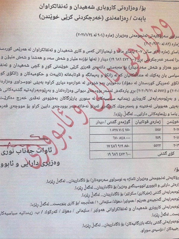 هەولێر، هەرێمی کوردستان، عێراق (GOV.KRD)- پاڵپشت بە یاسای ژمارە(9)ی ساڵی 2007 یاسای ماف و ئیمتیازاتی كەسوكاری شەهیدان و ئەنفالكراوان، ئەمرۆ بەرواری 2021/2/9 وەزیری دارایی وئابوری ئاوات جەناب نوری ڕەزامەندی دا لەسەر خەرجكردنی بڕی 19 ملیار و 686 ملیۆن دینار و 472 هەزار دینار بۆ مەبەستی دانەوەی قەرزی كرێی خوێندنی كوڕ و كچی شەهید و ئەنفالكراوان و زیندانیانی سیاسی، بە شێوەی نەقدی.