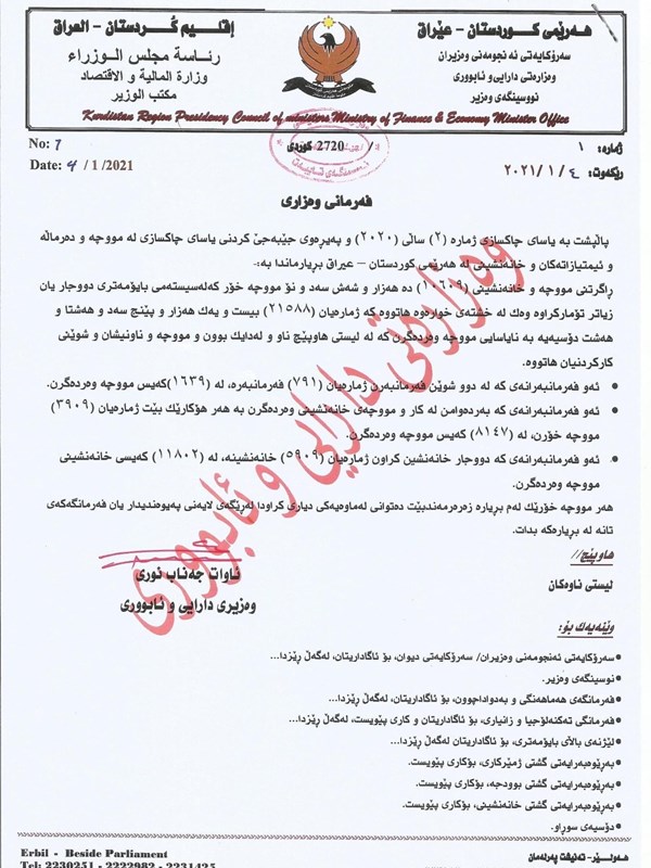 هەولێر ، هەرێمی كوردستان ، عیراق (GOV.KRD)- پاڵپشت بە یاسای چاكسازی ژمارە (2) ساڵی (2020) و پەیرەوی جێبەجێ كردنی یاسای چاكسازی لە مووچە و دەرماڵە و ئیمتیازاتەكان و خانەنشینی لە هەرێمی كوردستان بڕیاردرا بە:-