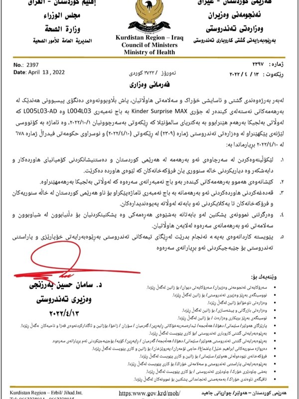 هەولێر، هەرێمی کوردستان، عێراق (GOV.KRD)- پاش بڵاوبوونەوەی دەنگۆی پیسبوونی هەندێک لە بەرهەمەکانی نەستەلەی کیندەر لە جۆری Kinder Surprise MAX بە باج نەمبەری L004L03 وە L005L03-AD کە لەوڵاتی بەلجیکا بەرهەم هێنرابوو بە بەکتریای سالمۆنێلا کە ڕێکەوتی بەسەرچوونیان ١/١٠/٢٠٢٢، وە ئاماژە بە کۆنووسی لیژنەی پێکهێنراو لە وەزارەتی تەندروستی لە ڕێکەوتی (١٠/٤/٢٠٢٢) و نووسراوی حکومەتی فیدراڵ لە ١٠/٤/٢٠٢٢، لەبەر بەرژەوەندی گشتی و ئاسایشی خۆراک و سەلامەتی هاووڵاتیان، وهزارهتی تهندروستی حكومهتی ههرێمی كوردستان چهند بڕیارێكی دهركرد كه ئهمانهن: