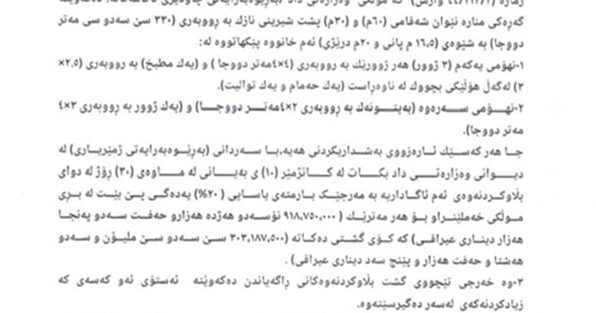 وەزارەتی داد موڵکێکی خۆی بە زیاتر لە سێ سەدو سێ ملیۆن دینار دەفرۆشێت