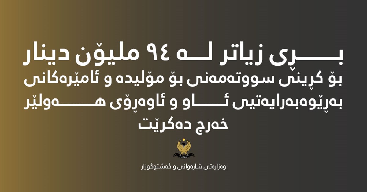 هەولێر، هەرێمی کوردستان (GOV.KRD)- بە مەبەستی باشتر بەڕێوەچوونی پرۆسەی بەرهەمێنانی ئاوی خواردنەوە و كاروباری بەڕێوەبەرایەتییەكە، وەزارەتی شارەوانی و گەشتوگوزار ڕەزامەندی نیشاندا لەسەر خەرجكردنی گوژمەی ٩٤ ملیۆن و ٥٠٠ هەزار دینار بۆ بەڕێوەبەرایەتیی ئاو و ئاوەڕۆی هەولێر.
