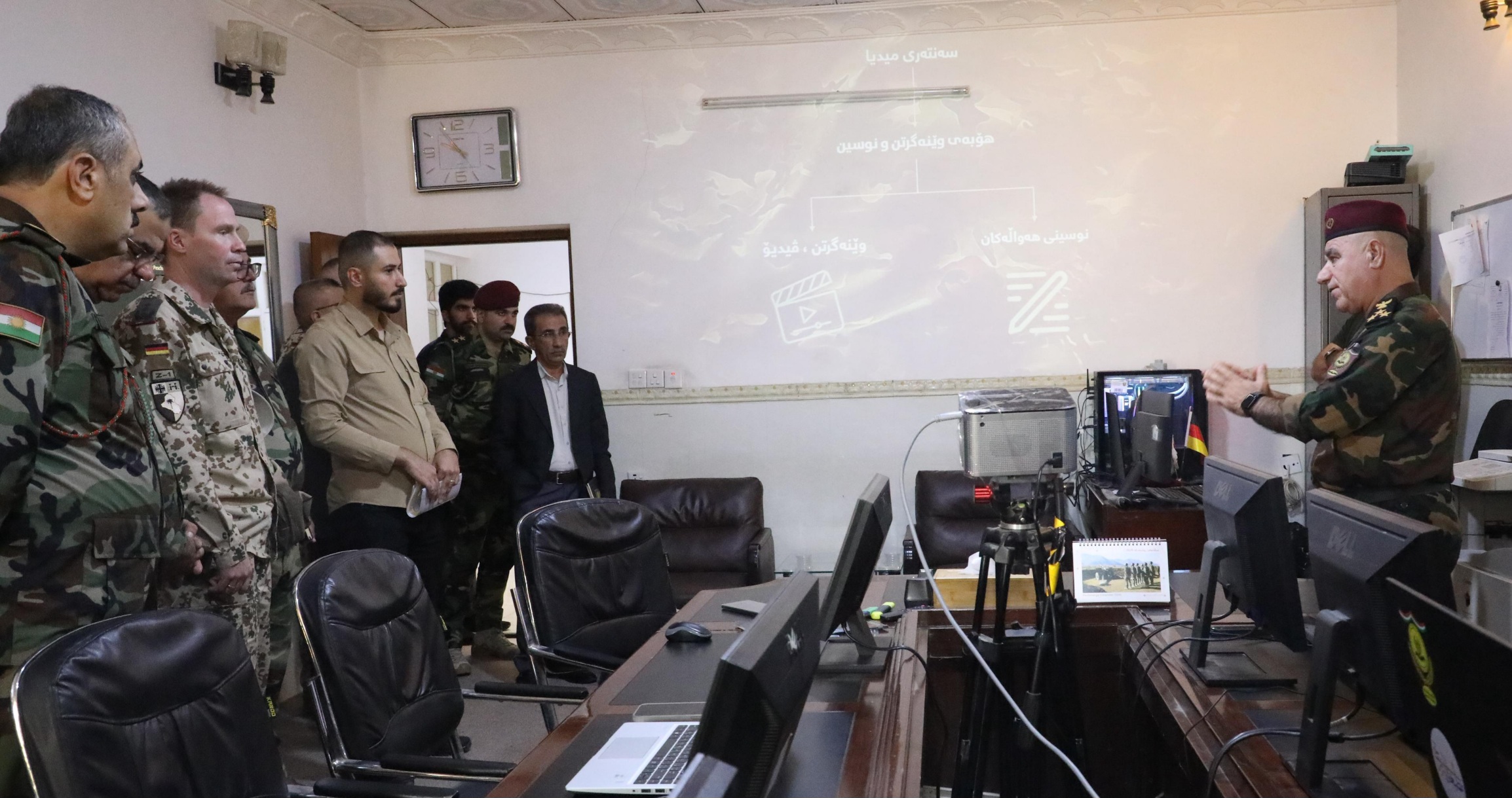 ڕۆژی دووشەممە، ١٣ی تشرینی یەکەمی ٢٠٢٥، عوسمان محەمەد مستەفا، بەڕێوەبەری گشتیی ڕاگەیاندن و هۆشیاریی نیشتمانی، شوان مەحموود، جێگری بەڕێوەبەری ڕاگەیاندن، پێشوازییان لە کۆڵۆنێڵ سێبستیان کلینک، فەرماندەی هێزەکانی ئەڵمانیا لە هەرێمی کوردستان و شاندێکی یاوەری کرد و باسیان لە دوایین هەنگاوەکانی پرۆژەی ستراتیژی میدیا و هۆشیاری کرد. هەروەها تیشک خرایە سەر کارەکانی ڕاگەیاندنی وەزارەتی پێشمەرگە و ڕۆڵی ڕاوێژکارانی سوپای ئەڵمانیا لە پێشخستنی ڕاگەیاندنی وەزارەت بەرز نرخێندرا.