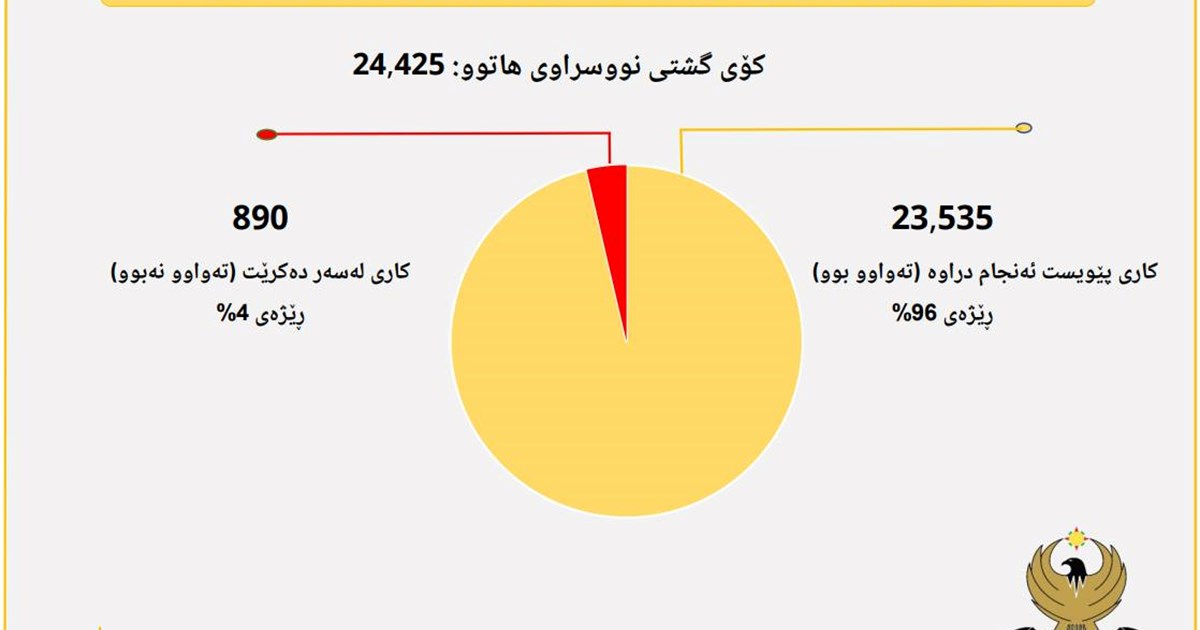 سەرۆکایەتیی دیوانی ئەنجومەنی وەزیران ئاشکرای دەکات، لە ماوەی ساڵی ٢٠٢٢، لە کۆی ٢٤،٤٢٥ نووسراوی ھاتوو، لە ڕووی کارگێری یاساییەوە توانراوە ٢٣،٥٣٥ نووسراو کاریان لەسەر بکرێت و تەواو بکرێن، کە دەکاتە ڕێژەی ٩٦٪ـی ئەو نووسراوانەی ھاتوون. ئەو نووسراوانەی کە تا ئێستا کاریان لەسەر دەکرێت یاخود تەواو نەبوون، ٨٩٠ نووسراون، کە دەکاتە ڕێژەی ٤٪ی نووسراوەكان.